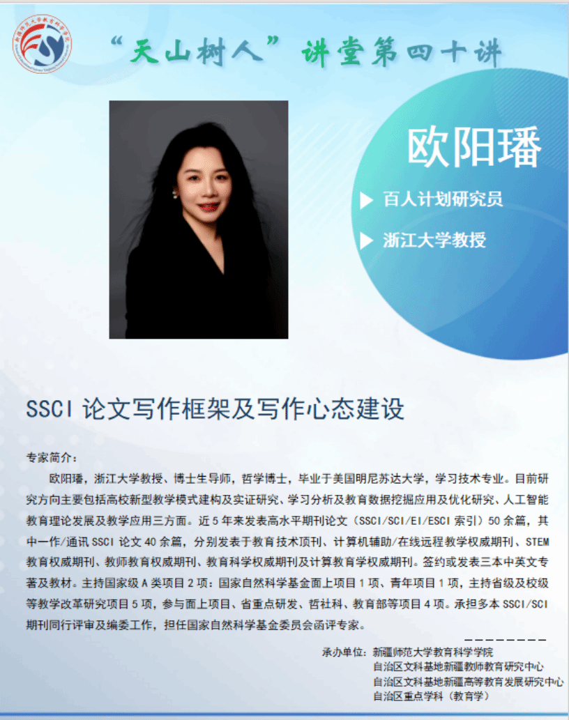 为提升我院师生的期刊论文写作能力,提高论文质量,3月27日下午,教育科学学院“天山树人”讲堂第四十讲在文润楼天山树人讲堂举办,浙江大学教授、博士生导师欧阳璠教授作了题为《SSCI论文写作框架及写作心态建设》的线上学术讲座。讲座由学院副院长马秀麟主持,学院师生近200人聆听了讲座。